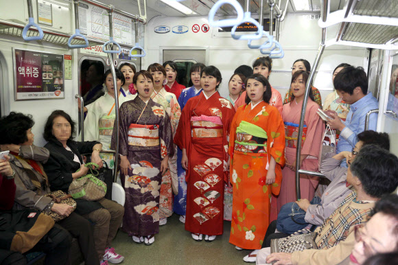 지하철에 울려퍼진 합창  제9회 부산국제합창제에 참가한 일본팀이 16일 부산도시철도 2호선 전동차에서 노래하고 있다. 17일까지 진행되는 도시철도 합창공연에는 필리핀, 중국, 일본, 러시아, 인도네시아, 싱가포르, 타이완 등 7개국 13개 팀 300여명이 참여한다. 부산합창제는 14개국 48개 팀 1300여명이 참가해 19일 막을 내린다.<br>부산 연합뉴스