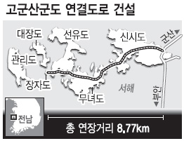 11일 익산지방국토관리청에 따르면 2800억원의 사업비를 들여 새만금지구와 고군산군도를 연결하는 도로건설사업을 추진하고 있다. 새만금 방조제에서 장자도까지 이어지는 8.7㎞의 도로는 2015년 완공될 예정이다.