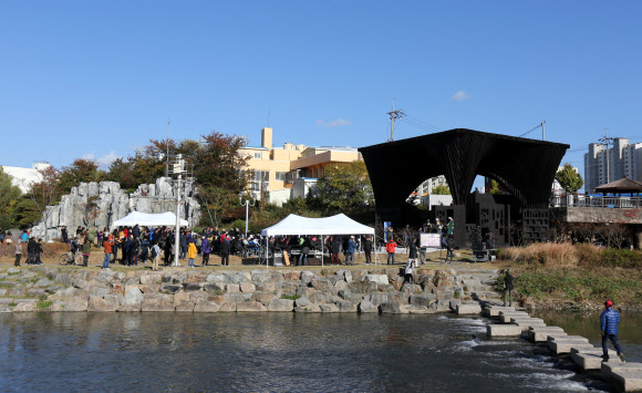 광주시가 삭막한 도시에 활기를 불어넣으려고 설치한 ‘광주폴리(소형 공공 건축물)’가 명물이 되면서 전국에서 견학이 잇따르고 관련 투어의 인기도 올라가고 있다. 사진은 지난 10일 북구 임동 광주천 두물머리에 세워진 ‘광주천 도서관’에서 열린 2차 광주폴리 개막식.