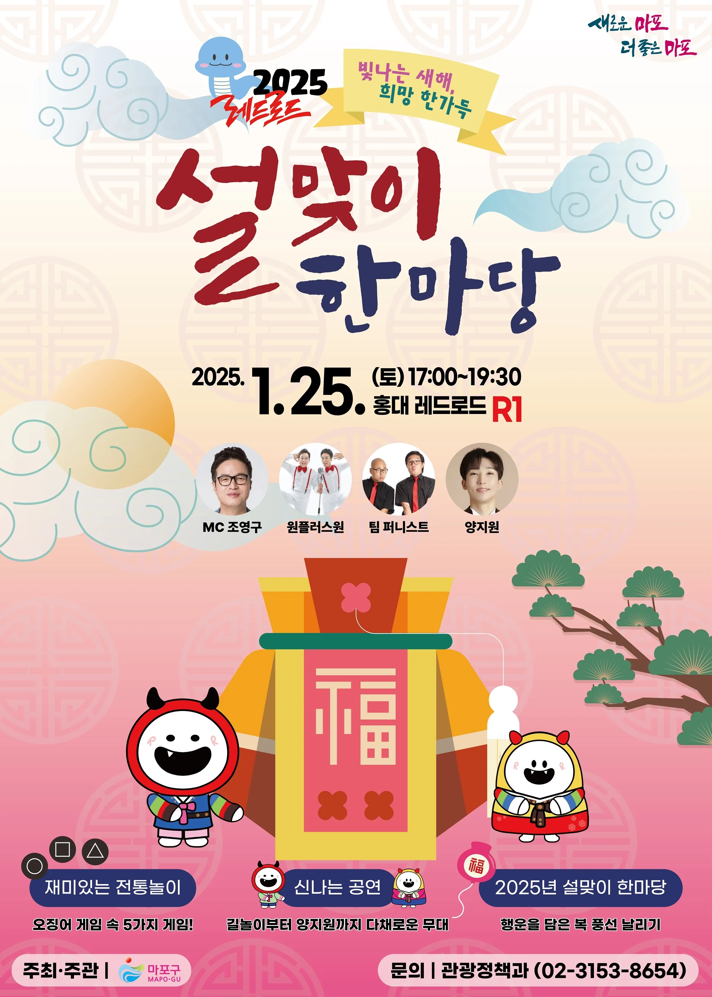 마포구(구청장 박강수)는 설 연휴가 시작되는 25일 레드로드 R1에서 ‘빛나는 새해, 희망 한가득 2025 레드로드 설맞이 한마당’을 개최한다.