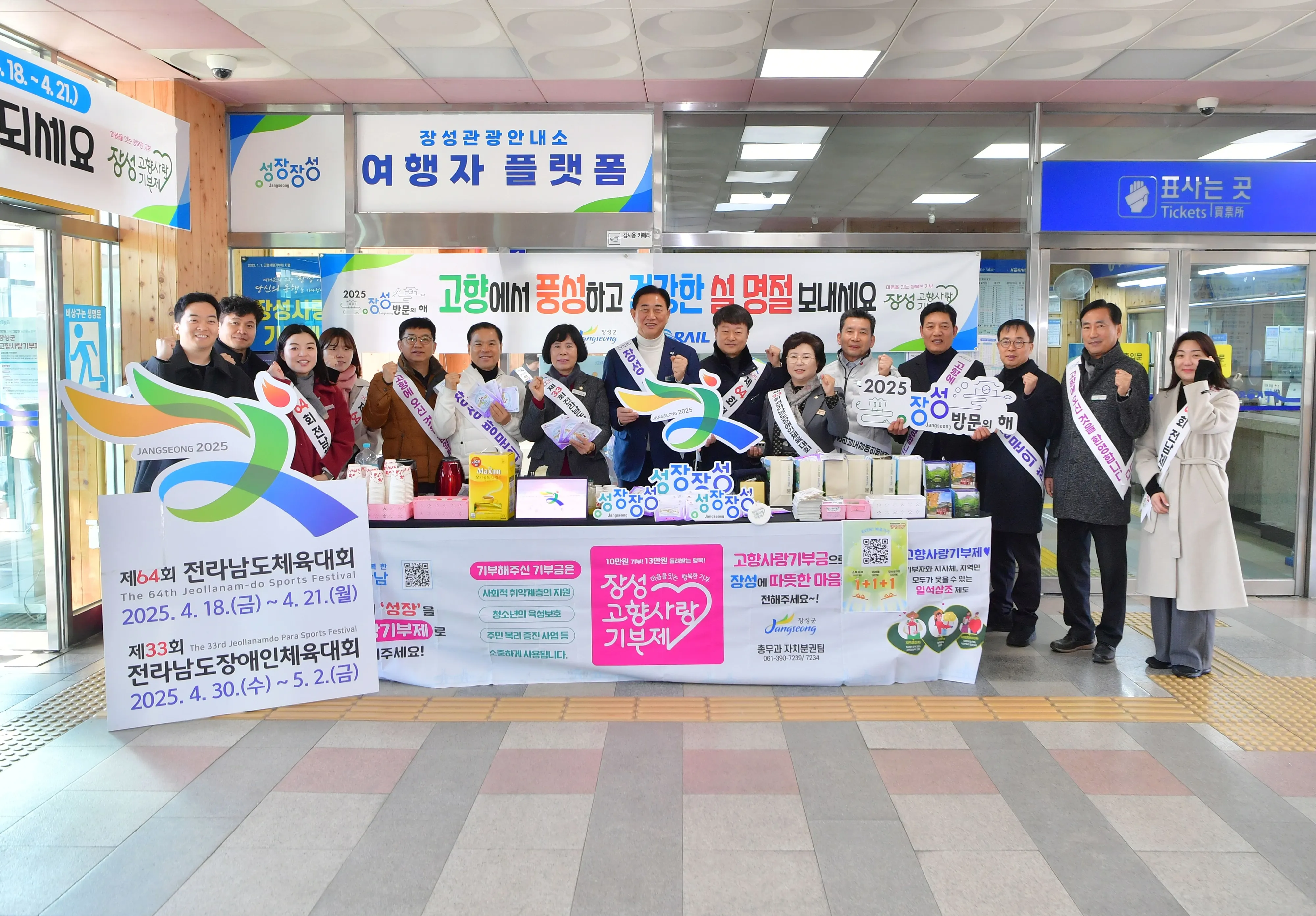올해 전남 도민체전 개최를 앞둔 장성군이 설 명절을 앞둔 25일 장성역에서 귀성객 맞이 행사를 가졌다.