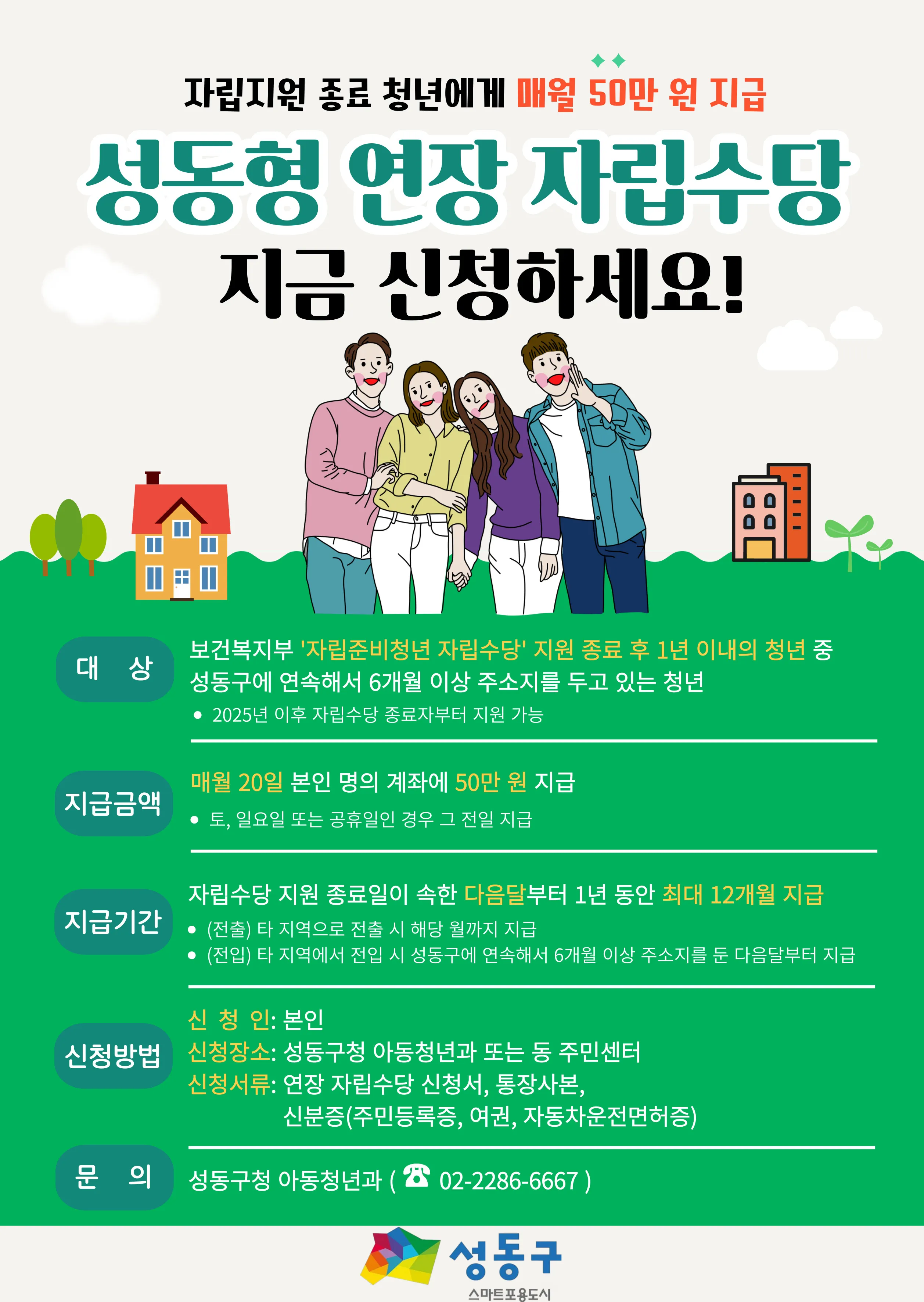 2025년에 정부 자립수당 지원이 종료되는 청년을 시작으로 순차적인 지원을 이어갈 방침으로, 지원사업 신청은 신분증과 통장사본을 지참해 성동구청 아동청년과 또는 동 주민센터에 신청서를 제출하면 된다.