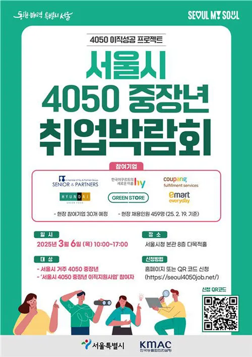 서울시는 다음 달 6일 시청 본관 8층 다목적홀에서 ‘2025 서울시 4050 중장년 취업박람회’를 개최한다고 26일 밝혔다. 이번 박람회에는 ㈜현대그린푸드, ㈜HY한국야쿠르트, 신한라이프㈜ 등 중장년 채용을 희망하는 30여개 기업이 참여한다. 이들 기업들은 현장 면접 또는 채용 정보 제공 등을 통해 중장년 구직자 450여명을 채용할 계획이다.