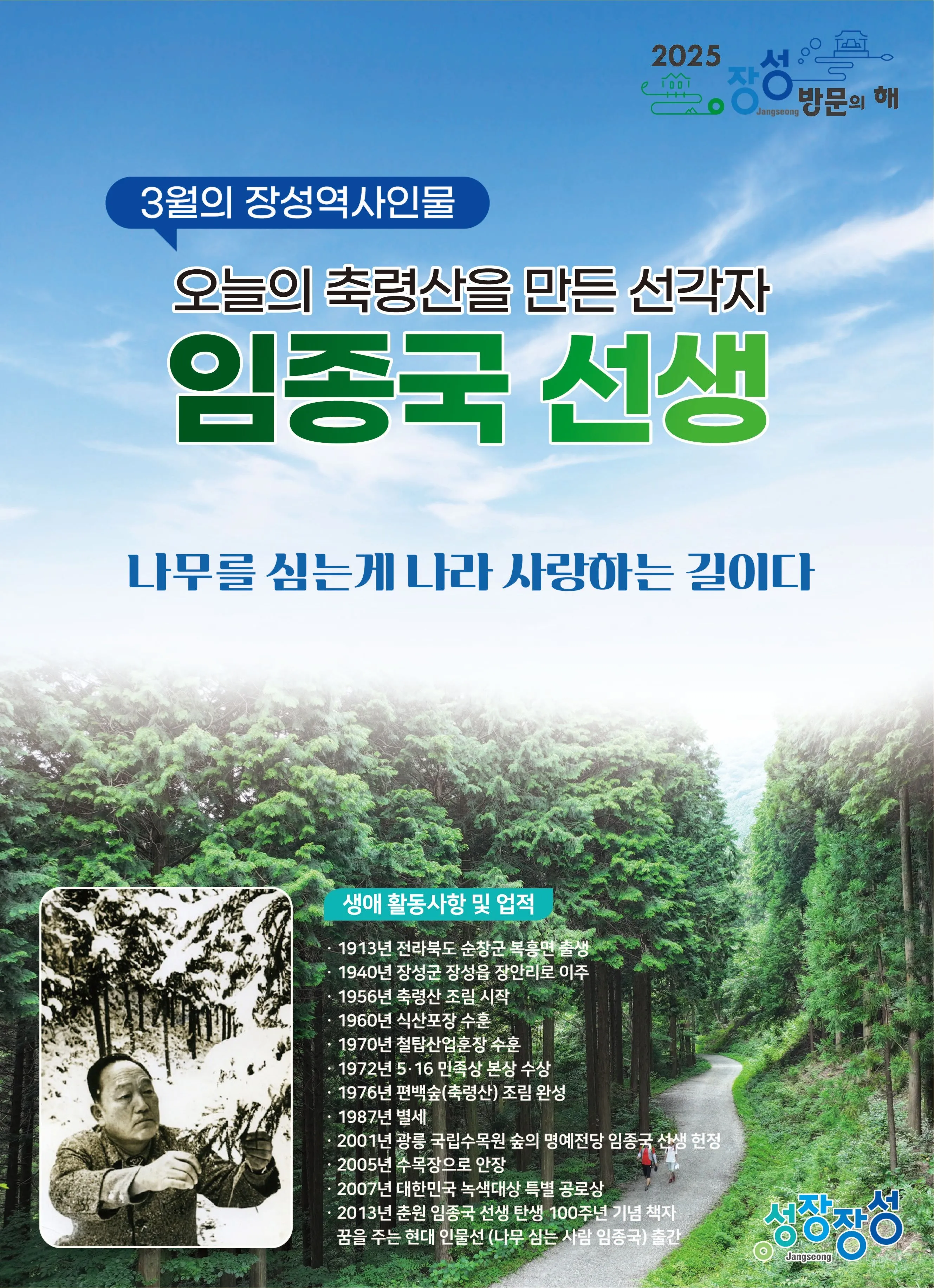 장성군이 ‘2025년 장성 방문의 해’를 맞아 3월부터 12월까지 ‘이달의 장성역사인물’을 선정한다고 밝혔다. 첫 번째 인물은 장성 축령산 편백숲을 가꾼 조림왕 춘원 임종국 선생이다.