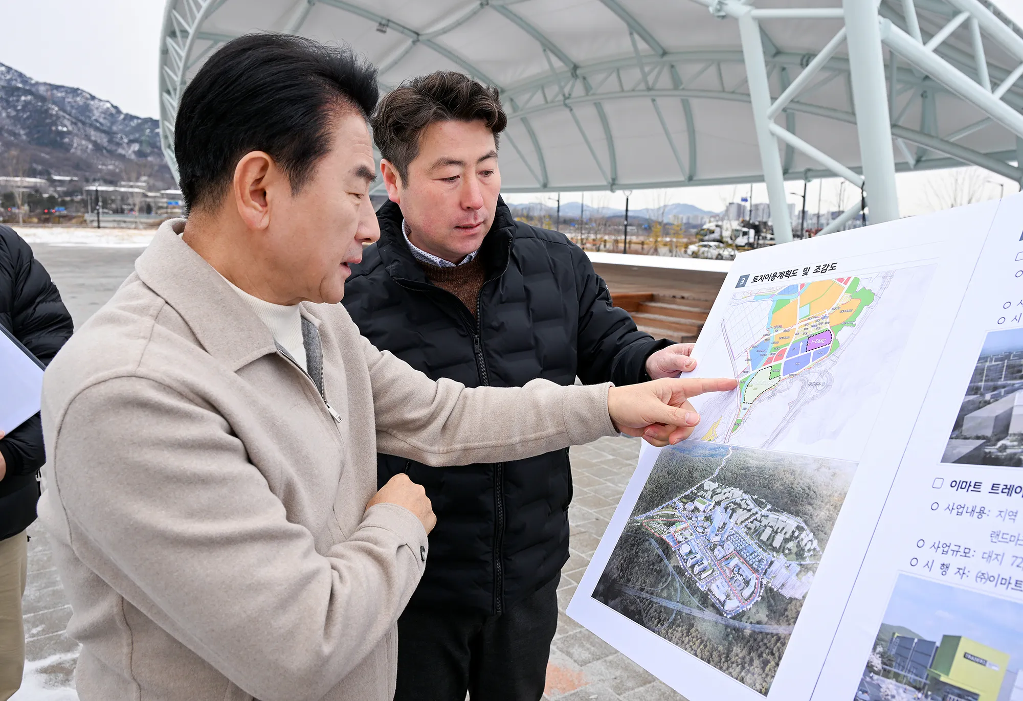 김동근 시장이 3월 5일 복합문화융합단지 준공에 앞서 단지 내 시장용지에서 현장점검을 하고 있다. [의정부시 제공]