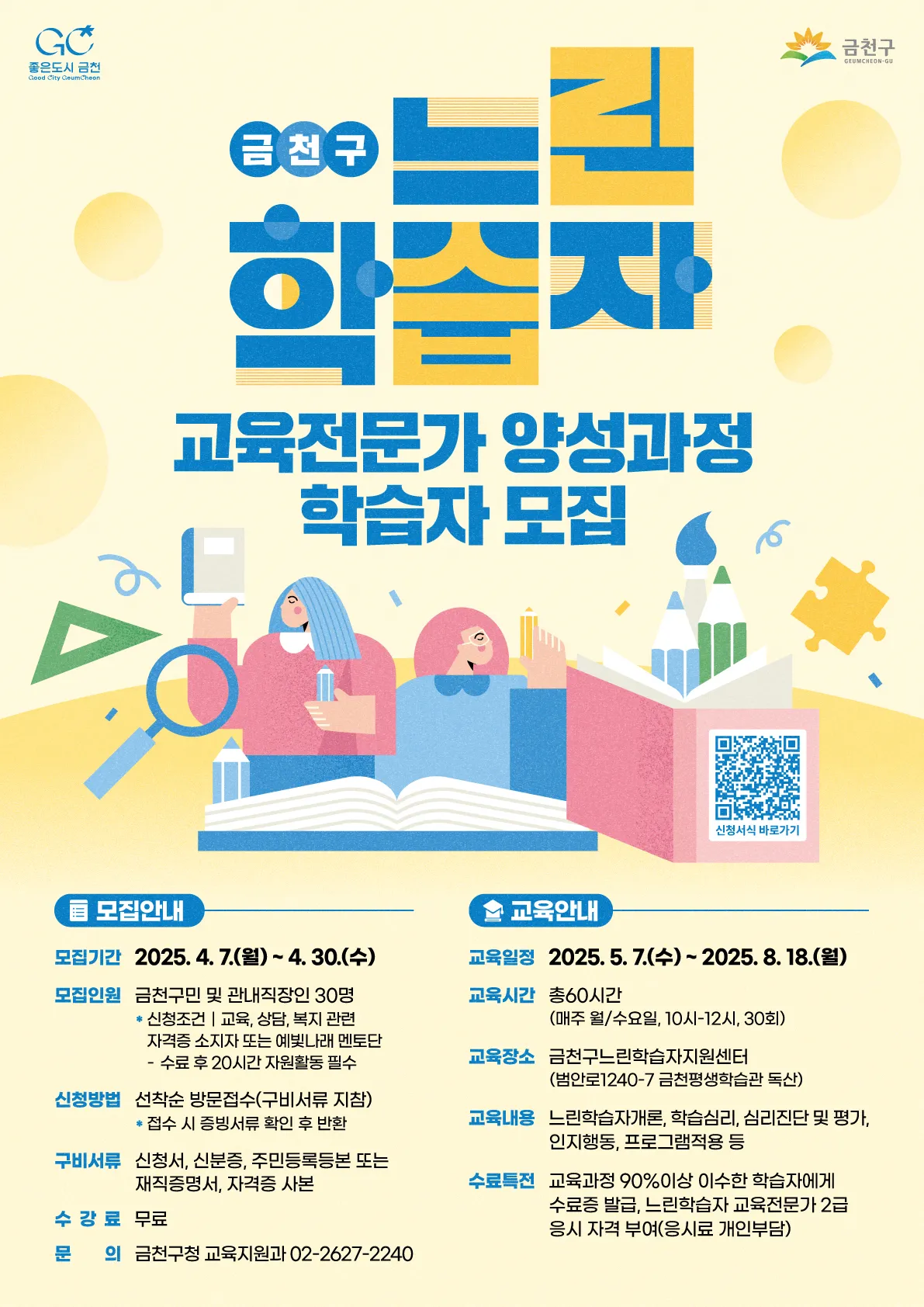 서울 금천구는 오는 30일까지 ‘느린학습자 교육전문가 양성과정’ 학습자를 모집한다고 16일 밝혔다.