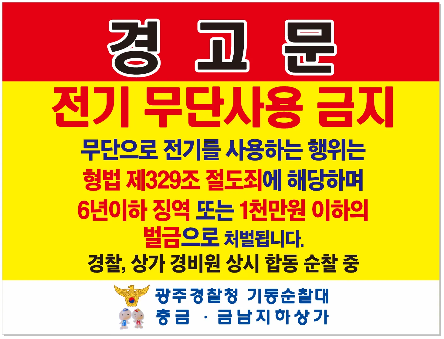 이에 기동순찰대는 상인회 등과 협업해 ‘전기 무단 사용은 형법상 절도행위로 명백한 범죄 행위’라는 내용을 담은 경고문 스티커를 제작해 지하상가 일대에 부착했다.