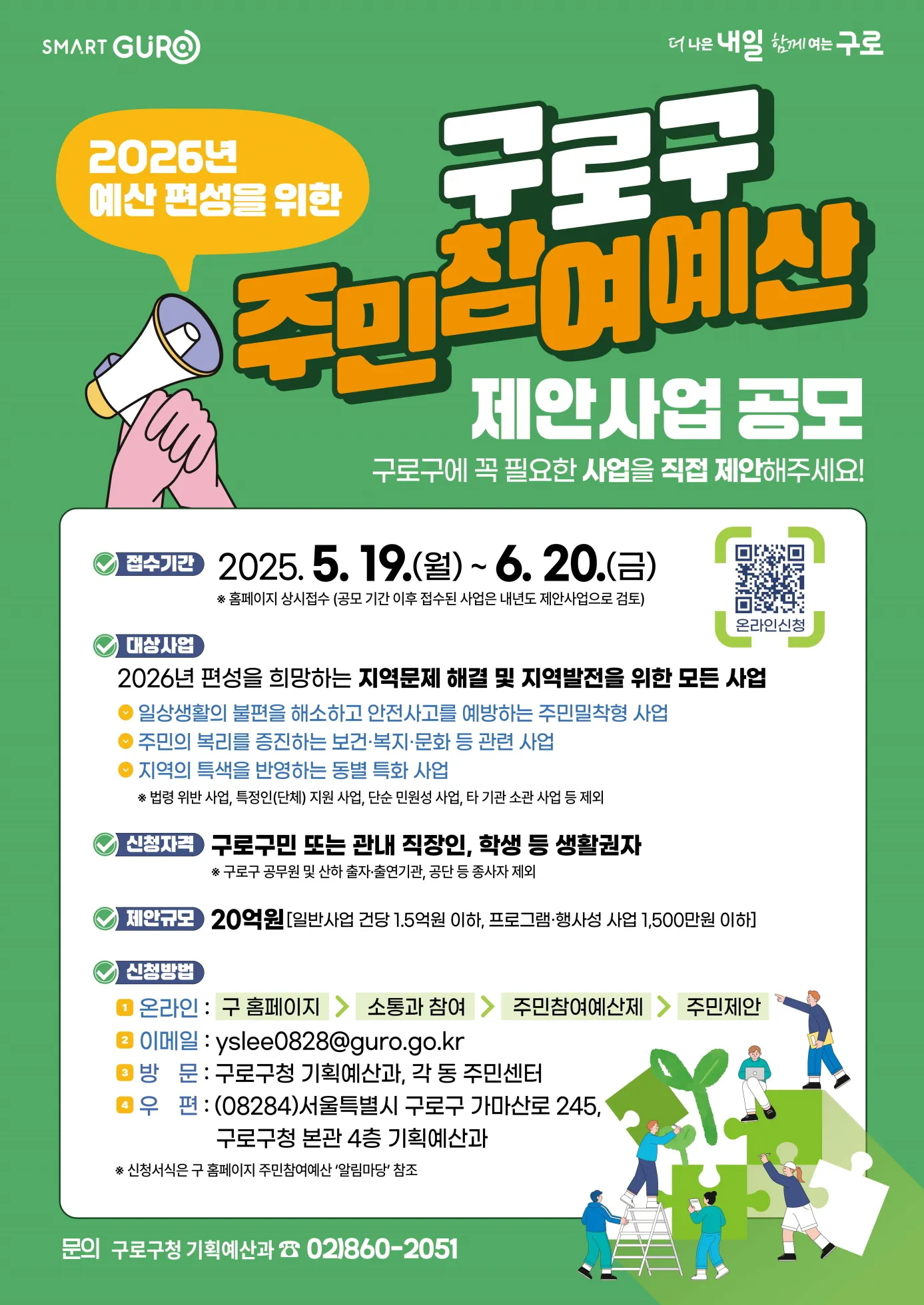 서울 구로구는 오는 19일부터 다음 달 20일까지 ‘2026년도 주민참여예산 사업 공모’를 실시한다고 15일 밝혔다.
