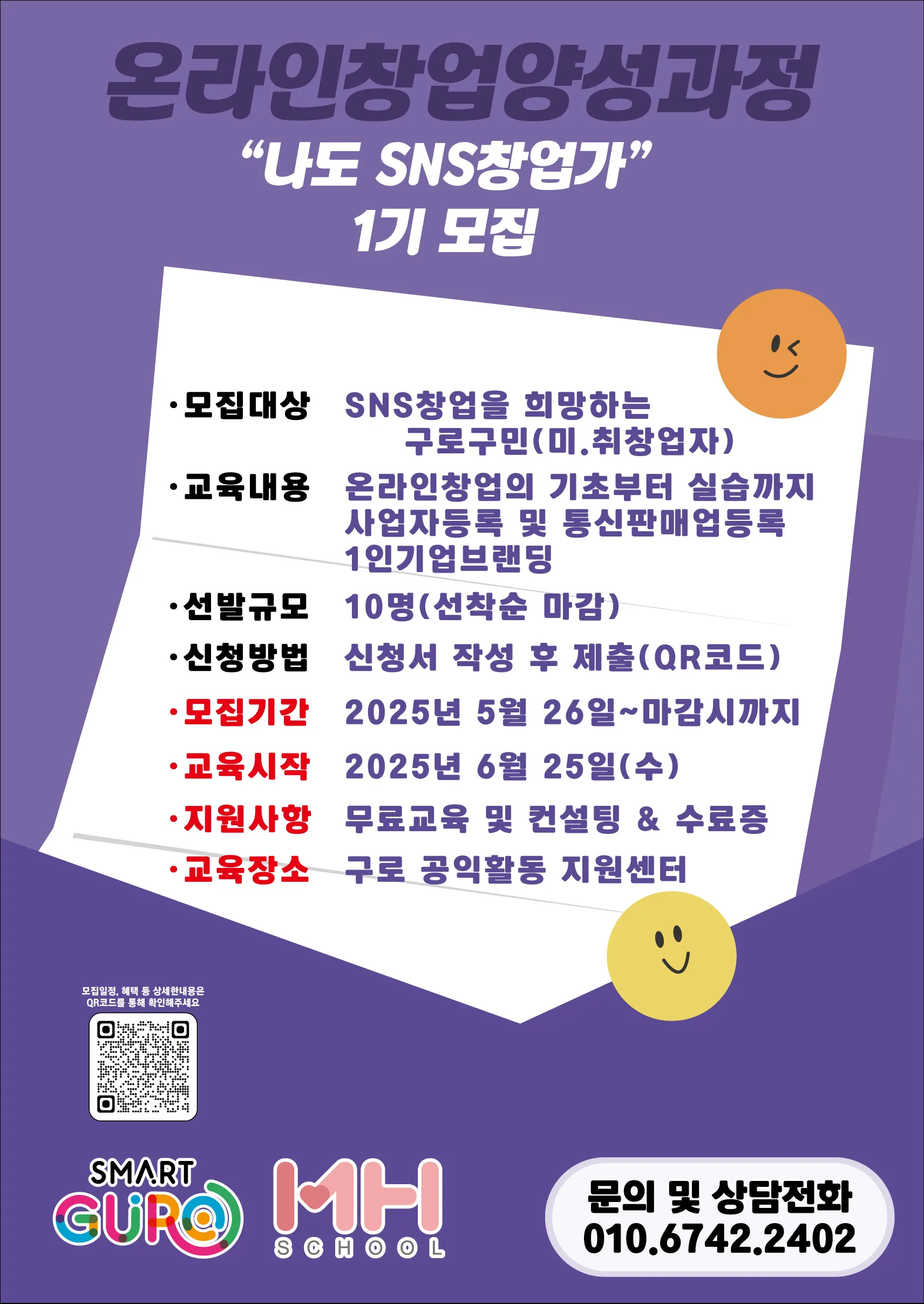 1기 교육은 6월 25일부터 8월 13일까지 매주 수요일 오후 1시 30분부터 4시 30분까지 구로구공익활동지원센터에서 진행된다. 온라인 창업의 기초부터 실습까지 다루는 기본 교육, 개인 맞춤형 컨설팅, 사업자등록·통신판매업 신고 절차 등 실전 중심 내용으로 진행될 예정이다.