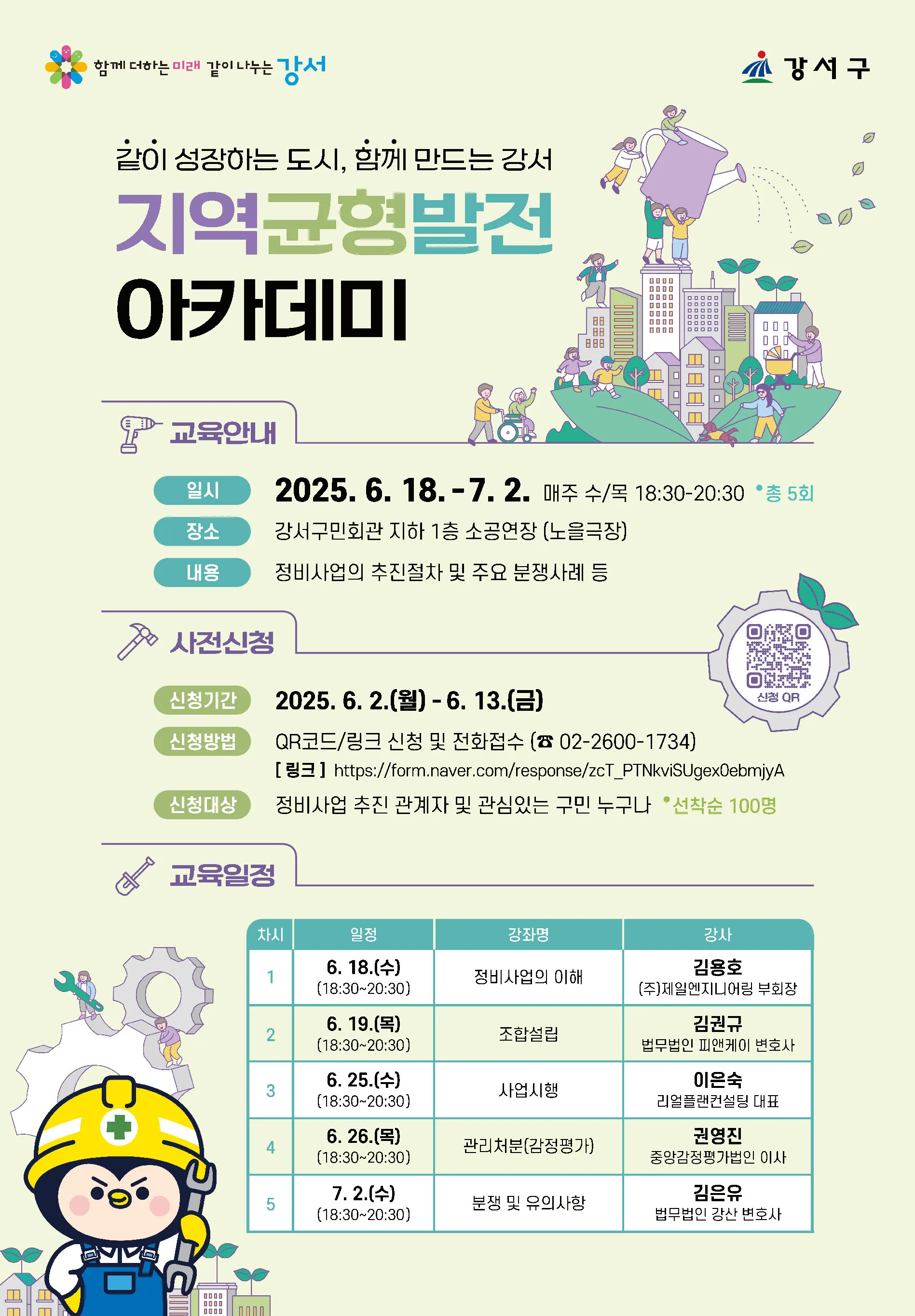 정비사업에 직접 참여 중이거나 관심 있는 구민이라면 누구나 무료로 신청할 수 있고, 모집 인원은 선착순 100명이다. 신청은 6월 2일부터 13일까지, 강서구청 누리집에 게시된 QR코드를 이용하거나 전화(02-2600-1734)로 하면 된다.
