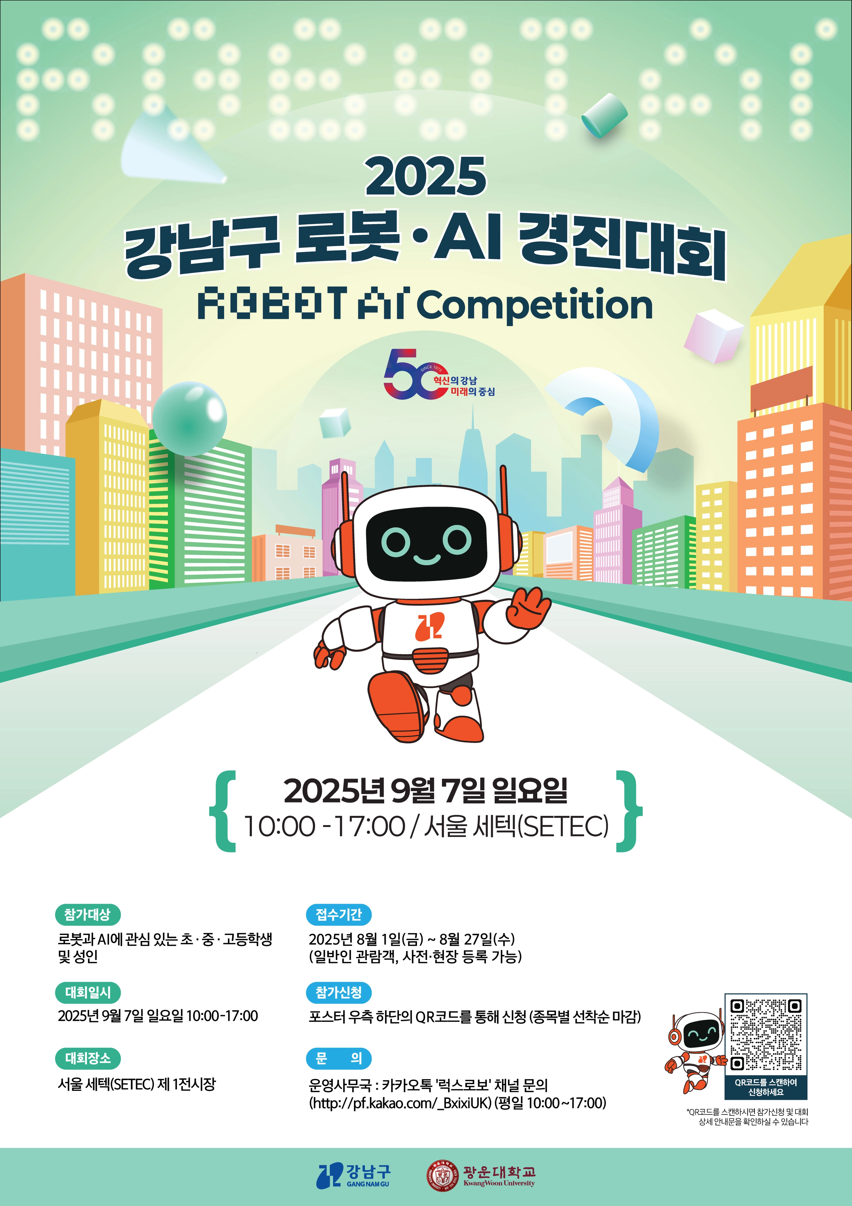 참가자 모집은 8월 1일부터 27일까지 온라인으로 진행되며, 종목별로 선착순 접수를 받는다. 접수는 공식 포스터에 기재된 QR코드를 통해 신청할 수 있다. 대회 종료 후 종목별 성적에 따라 총 32팀(명)을 선정해 강남구청장상, 광운대학교총장상 등 4개 훈격의 상장을 수여한다. 총상금은 720만 원 규모다. 특히 대상 수상자에게는 ‘로보페스타 2026’ 국제대회 한국 대표 출전 자격이 부여돼, 국내 청소년들이 세계 무대에서 기술 역량을 펼칠 수 있는 소중한 기회가 될 전망이다.