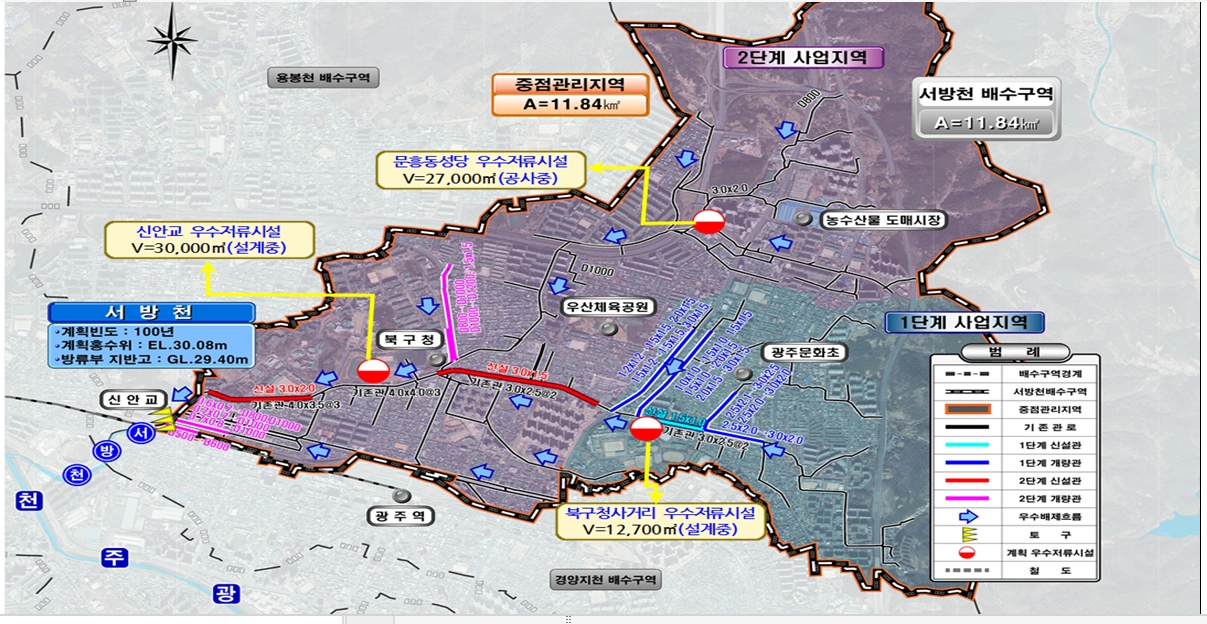 영산강유역환경청과 광주 북구는 최근 특별재난지역으로 선포된 북구지역의 침수피해 재발을 방지하기 위해 서방천 하수도정비 사업을 신속히 추진할 계획이라고 19일 밝혔다.