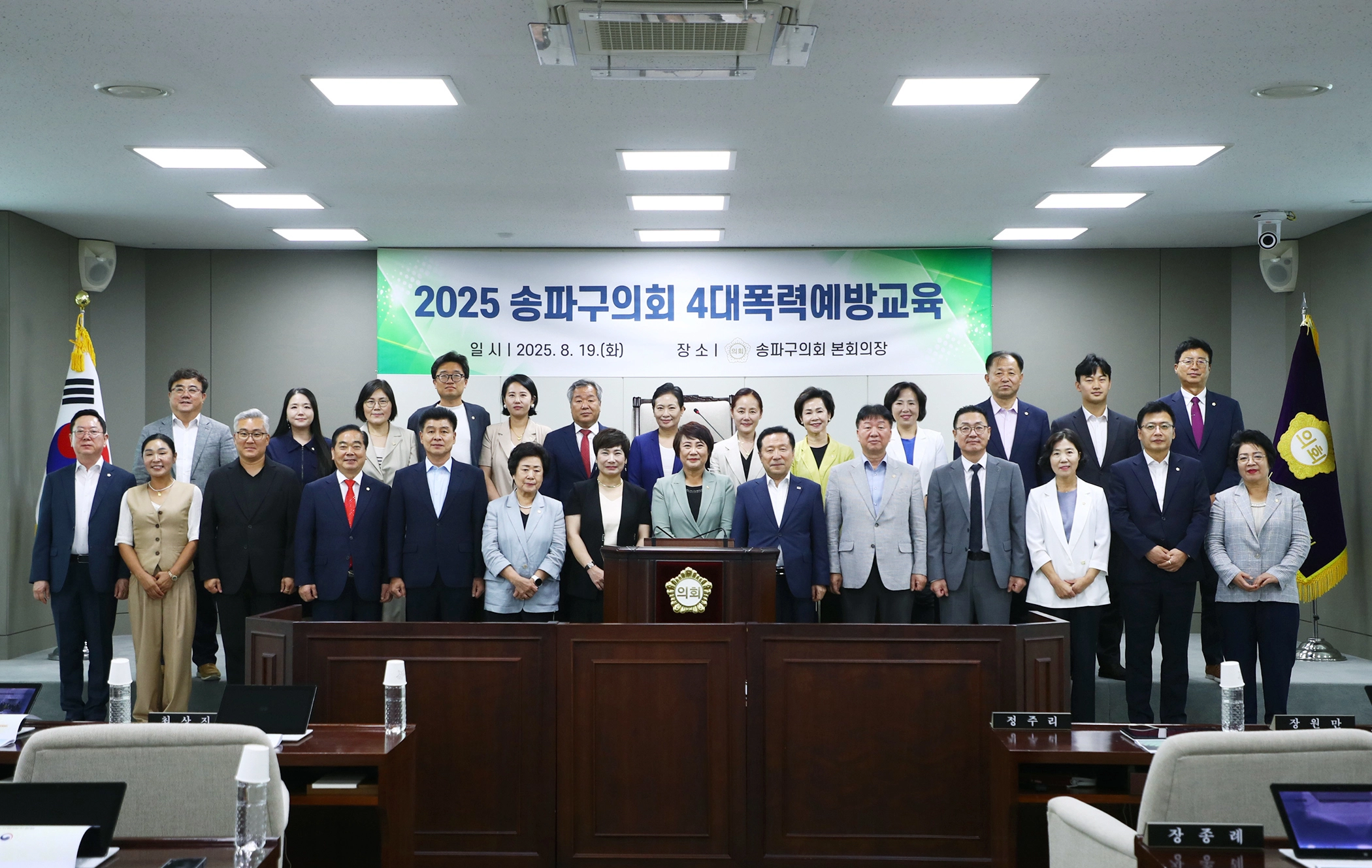 송파구의회가 지난 19일 4층 본회의장에서 의원들 대상으로 성희롱·성폭력 예방과 성인지 감수성 강화를 위한 4대폭력 예방교육(성희롱·성매매·성폭력·가정폭력)을 실시했다.