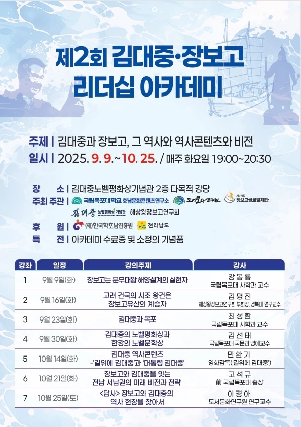 김대중노벨평화상기념관은 오는 9일부터 ‘김대중과 장보고, 그 역사 및 역사콘텐츠와 비전’을 주제로 ‘2025 김대중·장보고 리더십 아카데미’를 개최한다고 8일 밝혔다.