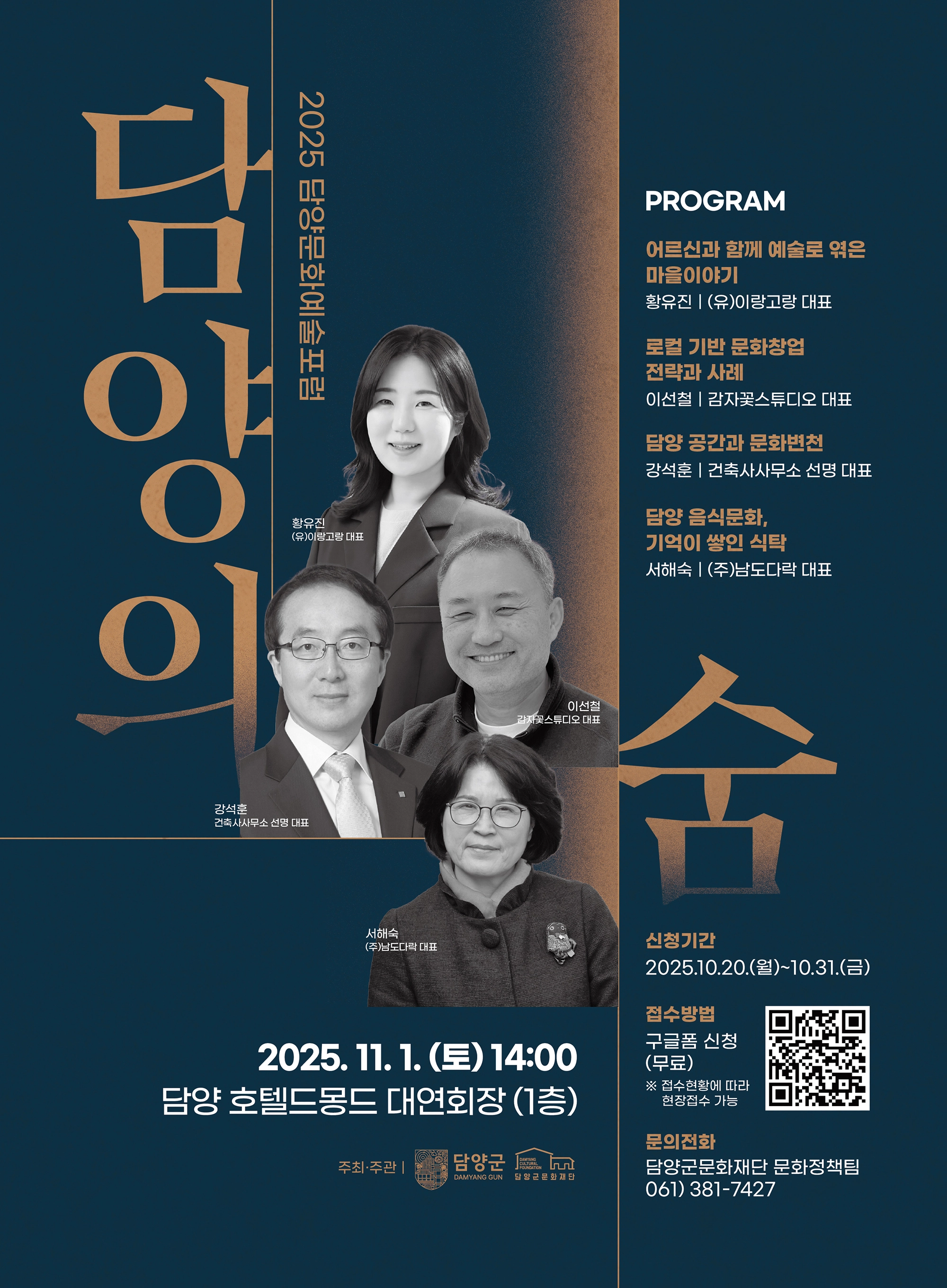 전남 담양군은 오는 11월 1일 토요일 오후 2시에 담양 호텔드몽드 대연회장에서 2025 담양 문화예술포럼 ‘담양의 숨’을 개최한다고 22일 밝혔다.