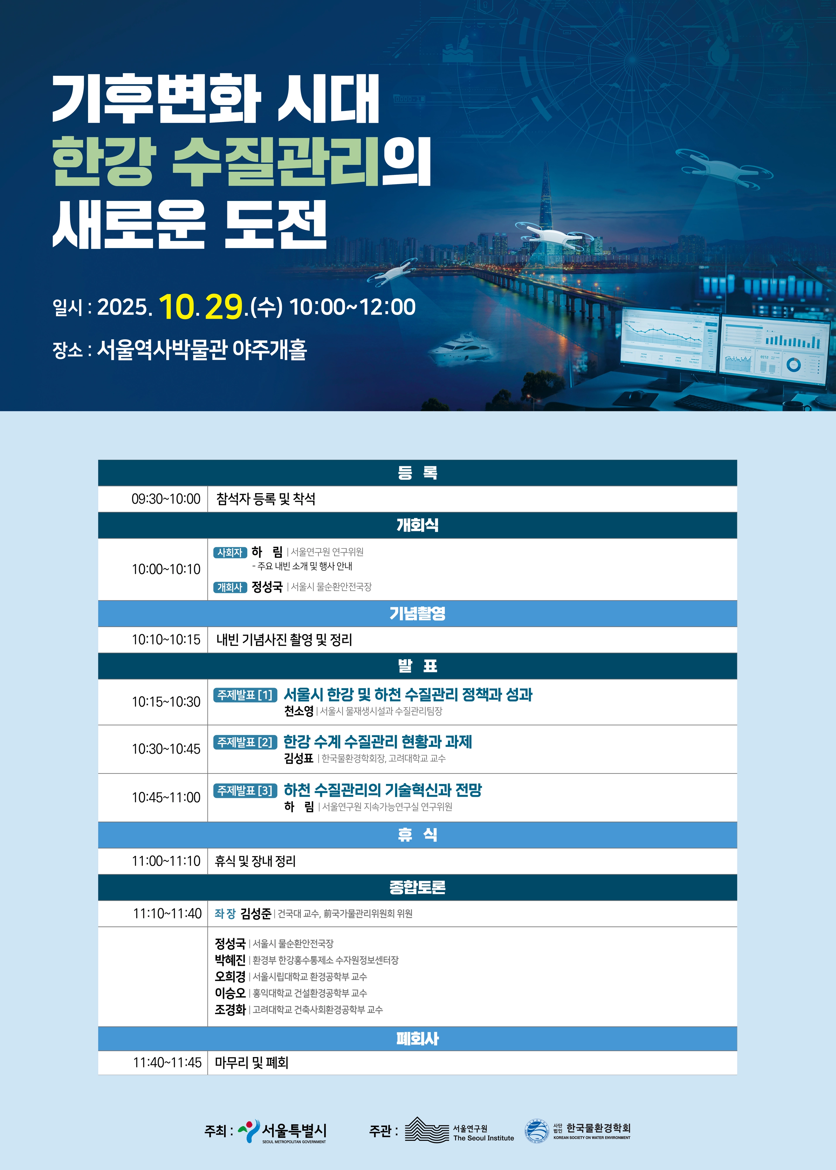 서울시가 주최하는 이번 심포지엄은 서울연구원, 한국물환경학회가 주관한다. 서울시는 그간 폐수배출시설 관리, 물재생센터 고도화, 조류경보제 및 수질오염총량제 시행 등 수질관리를 위한 지속적인 노력을 펼쳐왔다. 이러한 성과는 생태하천 복원과 ‘서울형 수변감성도시’ 조성 사업의 튼튼한 발판이 됐다.