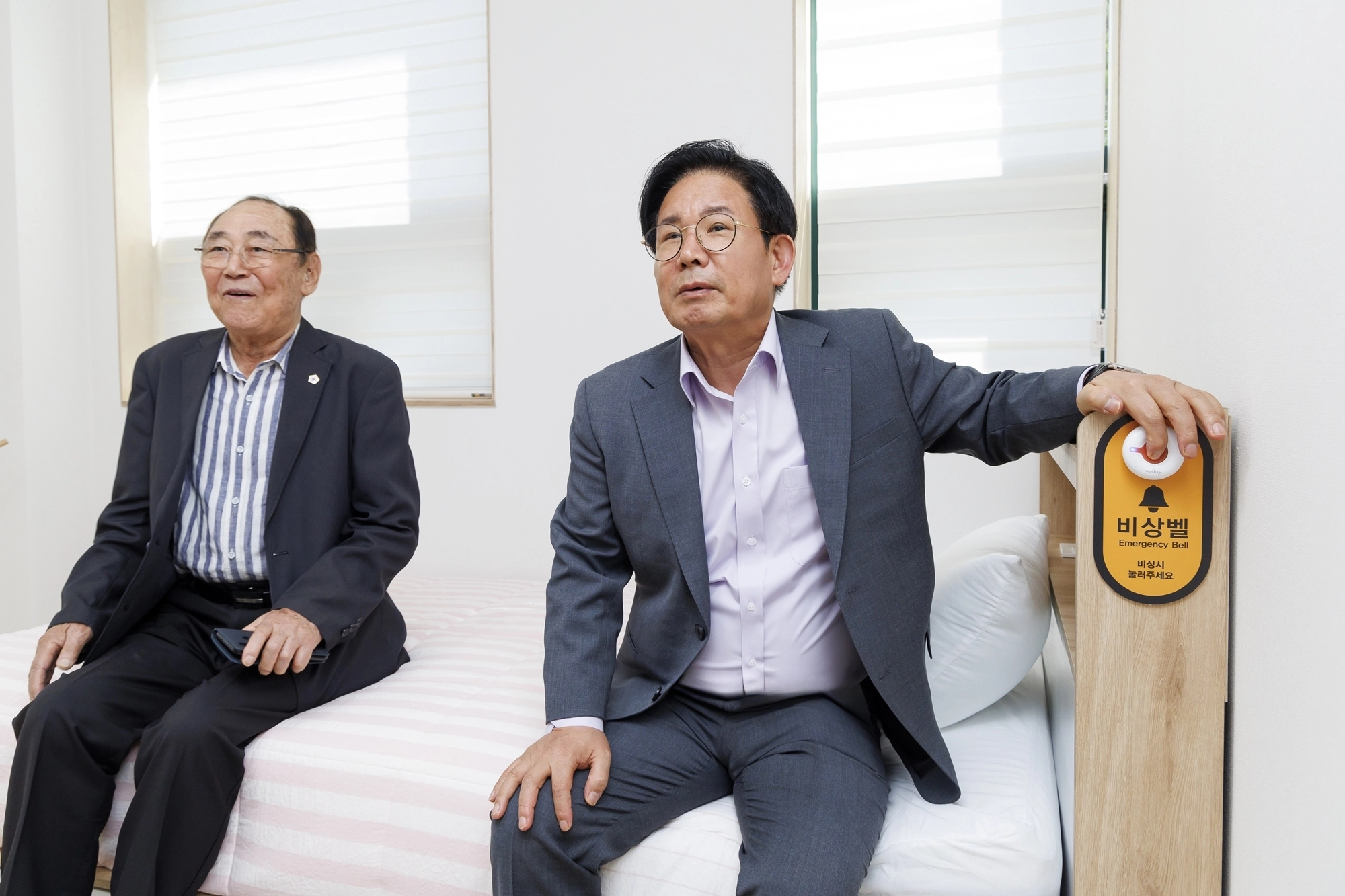 박강수(오른쪽) 서울 마포구청장이 창천동에 마련된 효도숙식경로당에서 시설 점검을 하고 있다. 마포구 제공