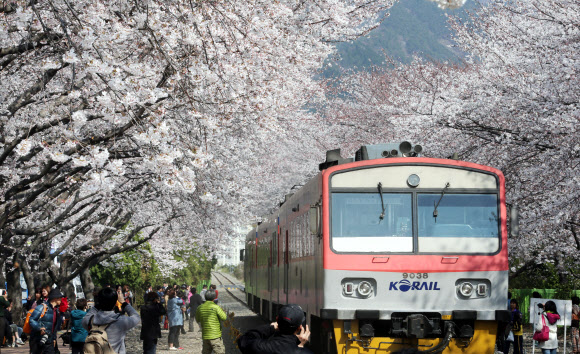 경남 창원시 진해구 경화역에서 활짝 핀 벚꽃 터널 사이로 열차가 지나가자 관광객들이 사진을 찍고 있다.