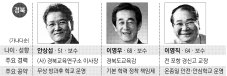 경북도교육감 선거는 보수 성향인 안상섭·이영우·이영직 후보의 3파전 양상이다. 교육감 3선에 도전하는 이영우 후보와 포항 영신고 교장을 지낸 이영직 후보 ‘빅2’ 간의 싸움이 치열하다는 분석이 지배적이다. 여기에 안 후보가 ‘젊음’을 무기로 추격전을 벌이고 있다.