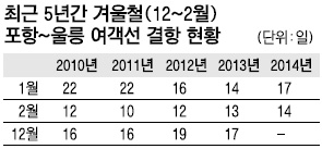 실제로 최근 4년간 겨울철 포항~울릉 간 여객선의 결항일수는 총 179일에 이른다. 2010년 40일, 2011년 48일, 2012년 47일, 지난해 44일 등이다. 이틀에 한번 꼴로 결항한 셈이다. 포항~울릉 간 여객노선은 ㈜대저해운의 썬플라워호(2394t, 정원 920명)가 독점한다. 이 여객선이 매년 겨울 선박정비와 검사에 따라 1~2개월간 휴항할 때면 씨플라워호(584t, 423명) 등이 대체 투입된다.