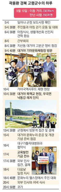 오후 3시쯤 비서가 일정이 급하다며 결재를 중단시키고 곽 군수를 군청 인근에 새로 지은 ‘대가야 문화누리’로 안내했다. 초현대식 건물 2층에 마련된 ‘선비 아카데미’ 강좌에 참석해 인사말을 하고 잠시 교육생들과 환담했다. 이어 곧장 1층 실내 수영장으로 내려갔다. 곽 군수가 이용객들에게 “혹시라도 불편사항은 없느냐”고 묻자 “끝내줍니다”라며 환호성으로 답했다. 문화누리 사무실을 찾아서는 16일로 예정된 건물 준공식과 개관 기념행사 준비에 만전을 기해 줄 것을 당부했다. 다시 군청으로 돌아와 2층 가야금방에서 열린 ‘대구가톨릭대병원·고령군 우호 교류 협약식’에 참석해 최경환 의료원장과 함께 협약서에 서명하고 공동 노력 방안에 대해 구체적인 의견을 교환했다. 이어 군수실에서 지역 중소업체로부터 교육발전기금 200만원을 전달받았다.