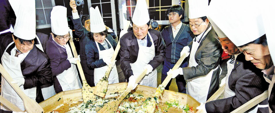 김영석(왼쪽 네 번째) 영천시장이 지난 16일 영천역 광장에서 열린 ‘제13회 영천한약축제’ 참가자들과 보약밥 나눔 퍼포먼스를 펼치고 있다.