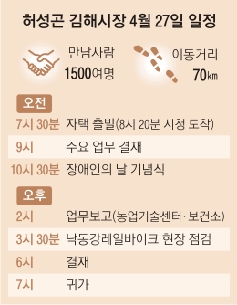 허 시장은 오전 10시 30분 김해체육관에서 열린 장애인의 날 기념식에 참석한 뒤 오후에는 2시부터 3시 30분까지 시장실에서 농업기술센터와 보건소 업무보고를 받았다. 그는 당선 다음주인 지난달 25~28일 4일간 실·국별로 업무보고를 받았다. 하루에 2~3개 실·국씩 주요 현안 중심으로 간략하게 업무보고를 받았다. 허 시장은 “김해시와 경남도 주요 부서에서 오랫동안 근무한 데다 김해에서 계속 살아 시정을 잘 알아 형식적인 업무보고로 행정력이 낭비되지 않도록 사업 방향 결정이나 시장 의견이 필요한 주요 현안 사업 위주로 보고하도록 했다”고 설명했다.