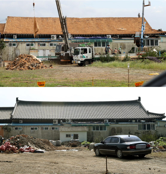 경주가 지난달 12일 규모 5.8 지진의 충격에서 서서히 벗어나며 제 모습을 찾고 있다. 경북 경주시 황남동 한 식당의 무너진 지붕을 지난달 21일 근로자들이 교체 작업하는 모습(위)과 12일 기와를 말끔히 이어 복구한 식당 모습.
