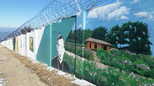 30일 경북 군위군 부계면 동산리 팔공산 정상 비로봉(해발 1193m) 인근 공군부대 담장. 군위군의 주요 관광지와 특산물을 그린 그림들이 벽면(길이 180m, 높이 2~3m)을 가득 채우고 있었고, 다른 벽에는 전투기가 창공을 누비는 모습을 스케치한 그림이 그려져 있었다. 모두 31점에 이른다.