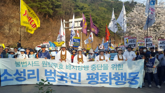 이들은 ‘불법사드 원천무효 소성리 범국민 평화행동’ 집회에서 “한·미 간 사드배치 합의는 법적 요건을 갖추지 못한 원천무효”라고 밝혔다. 또 4월을 사드장비 반입 저지를 위한 ‘평화의 달’, 소성리 마을을 ‘평화의 마을’로 선포했다. 참가자들은 집회를 마친 뒤 700여m 떨어진 성주골프장 입구 진밭교까지 평화행진을 벌였다.