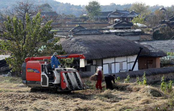 경상 익어가는 가을을 탈곡하네 입력 2017 11 01 21:48 수정 2017 11 02 01:18 기사 소리로 듣기 다시듣기 익어가는 가을을 탈곡하네1일 경북 안동 하회마을에서 농민이 탈곡기로 누렇게 익은 벼를 수확하고 있다.안동 연합뉴스 1일 경북 안동 하회마을에서 농민이 탈곡기로 누렇게 익은 벼를 수확하고 있다.안동 연합뉴스 ⓒ 트윅, 무단 전재 및 재배포 금지