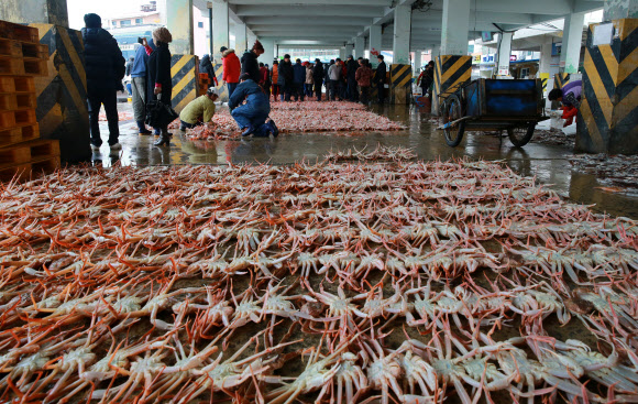 올해 첫 대게잡이가 시작된 27일 경북 울진에서 중매인들과 상인 등이 대게 상태를 살펴보고 있다. 울진 지역은 대게 자원 보호를 위해 매년 12월 1일부터 대게잡이를 하지만 인근 지역 어선들이 어장을 선점하는 것을 막고 어장 확보를 위해 올해 조업 시기를 앞당겼다.