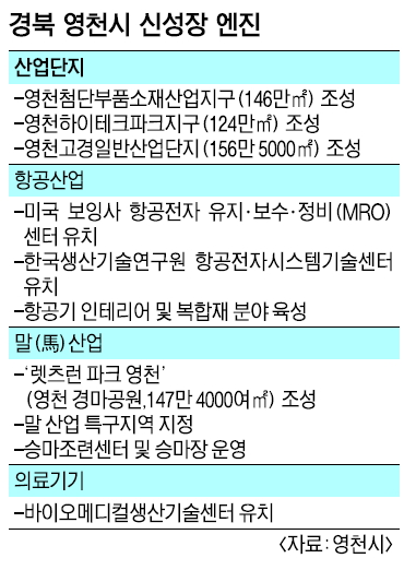 -국내 최초로 미국 보잉사의 항공전자 유지·보수·정비(MRO)센터를 유치하고, 항공전자 부품의 시험평가, 인증, 연구개발 등을 담당하는 항공전자시스템기술센터를 준공했다. 영천처럼 작은 기초자치단체가 세계 최대 항공기 제작사인 보잉사를 유치해 항공 산업을 육성하는 경우는 세계적으로 드물다. 보잉 항공전자 MRO센터는 앞으로 아시아·태평양 항공기 전자 부품 정비 거점으로 육성될 예정이다. 시는 또 항공 산업의 블루오션으로 떠오른 항공기 인테리어와 복합재 산업 육성 사업에도 적극 나설 채비를 하고 있다. 항공기 인테리어의 해외시장은 2015년 17조원에서 2020년 30조원으로 성장할 것으로 전망된다.