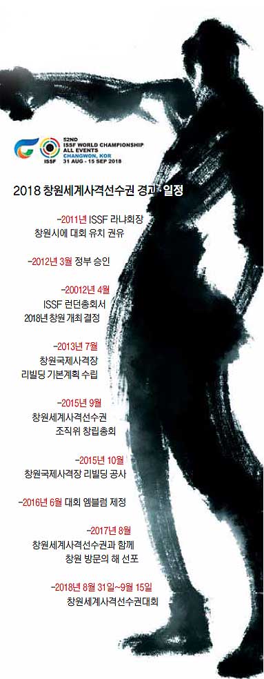 국제사격연맹(ISSF) 주관으로 4년마다 열리는 지구촌 사격인들의 최대 축제인 제52회 세계사격선수권대회가 오는 8월 경남 창원에서 열린다. 세계 최고 총잡이를 가리는 대회다. 아시아권에서 세계사격선수권대회를 개최한 나라는 대한민국이 유일하다. 우리나라는 1978년 서울대회에 이어 이번이 두 번째다. ISSF는 2012년 4월 런던 총회에서 2018 창원대회 개최를 결정했다. 창원시는 2015년 세계사격선수권 대회조직위원회를 출범시켜 대회 준비에 온 힘을 쏟고 있다.