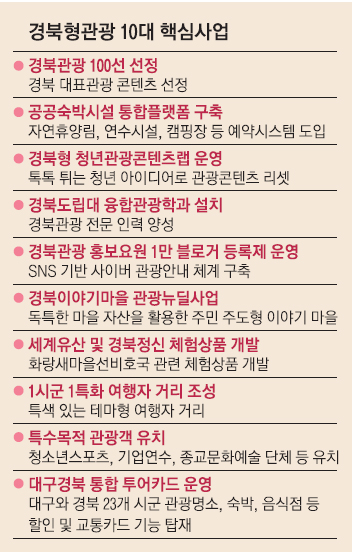 경북도관광진흥기금도 조성한다. 10년간 1000억원 조성을 목표로 도가 540억원, 시·군이 460억원을 분담할 계획이다. 분담금에 기금운용 수익금 등으로 해마다 100억원을 모아 관광 인프라 구축과 관광진흥사업 등에 사용한다. 도는 이를 바탕으로 관광콘텐츠 개발과 일자리 창출에 초점을 둔 ‘경북형 관광 10대 핵심사업’을 추진한다.