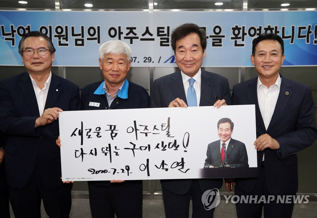그는 아주스틸에서 생산해 자기 얼굴을 프린트한 철판에 ‘새로운 꿈 아주스틸, 다시 뛰는 구미산단!’이라고 적었다.