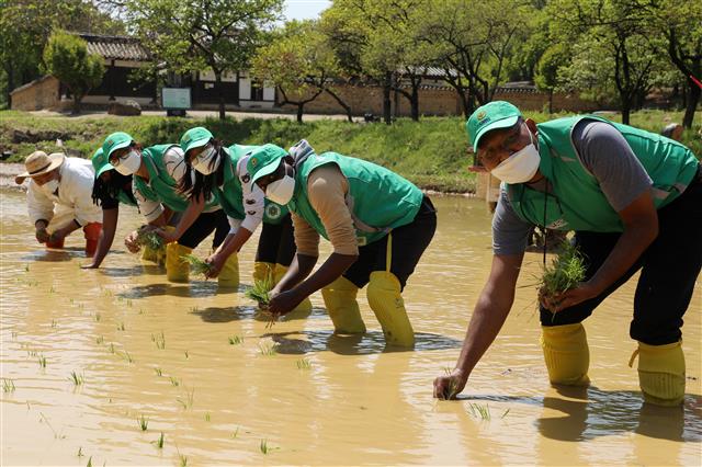 3일 오전 경북 경산시 영남대 경산캠퍼스 민속촌 앞 논에서 가나, 미얀마, 카메룬, 인도네시아 등에서 유학 온 박정희새마을대학원 새마을국제개발학과 학생들이 모내기 체험을 하고 있다. 이날 모내기한 조생종 벼는 오는 9월 이들이 직접 추수한다.