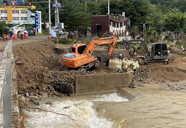 25일 부산지방국토관리청 포항국토관리사무소 직원들이 중장비를 동원해 경북 포항시 북구 죽장면 국도 31호선 포항~청송 구간 입암교 구간에 대한 복구 작업을 하고 있다. 이 도로는 지난 24일 ‘제12호 태풍 오마이스’로 인해 유실됐다.