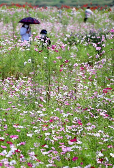 추석연휴 마지막 날인 22일 나들이객들이 코스모스가 활짝 핀 경북 경산시 하양읍 대부잠수교 인근 금호강변을 산책하고 있다.