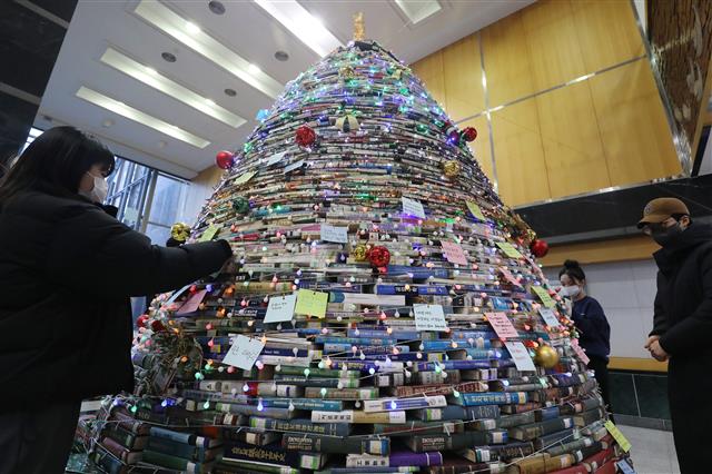 3500권으로 만든 ‘북 트리’  1일 대구대 경산캠퍼스 창파도서관 로비에서 열린 ‘크리스마스 북(Book) 페스티벌’을 찾은 학생들이 소망 북트리에 소원지를 붙이고 있다. 대구대는 해마다 오래되거나 낡아 폐기할 책을 이용, 크리스마스트리를 만들고 있다. 올해는 3500여권의 책을 쌓아 높이 4m, 폭 3.5m 크기의 트리를 만들었다.<br>경산 뉴스1