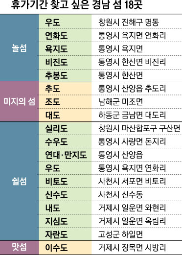 ‘섬사람들 사이에 섬이 있다./그 섬에 가고 싶다.’(정현종 시 ‘섬’의 전문) 무섭게 펄펄 끓는 찜통더위가 전국을 뜨겁게 달구자 해수욕장, 계곡 등으로 피서객 발길이 몰린다. 북적대는 육지에서 잠깐이나마 비켜 여유와 자유를 누리고 싶은 사람들은 다소 불편한 바닷길을 건너 섬을 찾는다. 경남도가 찾아가고 싶은 지역의 섬 18곳을 골라 추천했다. 휴식 유형에 맞췄다. 놀기 좋은 ‘놀섬’이 5곳, 잘 알려지지 않은 ‘미지의 섬’이 3곳, 구석구석 섬 경치를 구경하며 편안하게 쉬기 좋은 ‘쉴섬’이 9곳, 싱싱한 해산물을 먹으며 휴양하는 ‘맛섬’이 1곳이다.