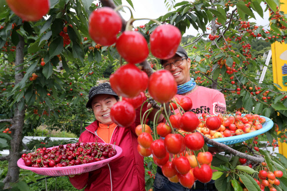 10일 오전 경남 함양군 함양읍 가재골 체리농장에서 한 농민 부부가 재배한 체리를 들어 보이고 있다. 체리는 비타민C가 풍부해 피로 해소, 불면증 개선, 통증 완화, 노화 억제, 피부 미용 등에 효능이 있는 것으로 알려졌다.