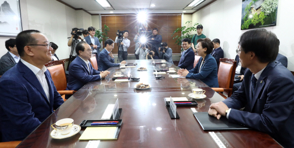 김현미(오른쪽 두 번째) 국토교통부 장관이 20일 서울 용산구 국토부 서울사무소에서 김경수(왼쪽 세 번째) 경남도지사, 오거돈(왼쪽 두 번째) 부산시장, 송철호(왼쪽 첫 번째) 울산시장 등과 김해신공항 관련 현안사항을 논의하고 있다.<br>오장환 기자 5zzang@seoul.co.kr