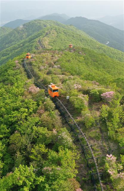 다음달 말 개장을 앞둔 경남 함양군 병곡면 대봉산 휴양밸리에서 27일 모노레일이 시범운행되고 있다. 대봉산 휴양밸리는 국내 최장(3.93㎞)의 산악형 모노레일과 지프라인, 산림욕장, 숙박·캠핑 시설 등 자연 속에서 힐링할 수 있는 다양한 기반 시설들을 갖췄다.