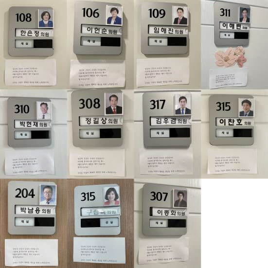 경남 창원시의회 의원 방마다 문 앞에 붙어 있는 “당신의 건강이 우리의 건강입니다. 8월 31일까지 제 방은 제가 치웁니다. 맡겨주십시오.”라고 적혀 있는 종이들. 창원시의원들은 한여름 청소 노동자의 수고를 덜어 주고자 ‘8월 말까지 제 방은 제가 치웁니다’ 릴레이를 시작했다.