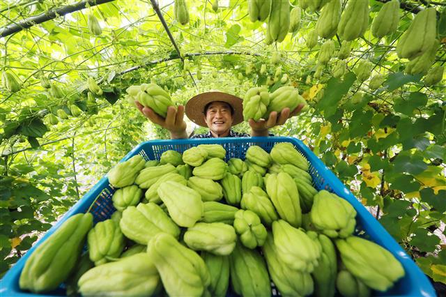 12일 경남 함양군 백전면의 한 농장에서 농부 박상대씨가 열대 작물인 차요테를 수확한 뒤 들어 보이고 있다. 박과에 속하는 채소인 차요테는 비타민C, 엽산과 마그네슘 등 미네랄이 풍부하고 당뇨와 고혈압, 변비 등에 효능이 있는 것으로 알려져 있다.