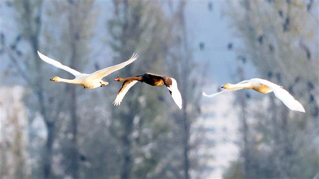 흑고니(가운데)가 19일 경남 창원 주남저수지에서 비행하고 있다. 흑고니는 호주 특산종으로 우리나라에 찾아오지 않는 종이다. 동물원에서 사육하던 개체가 탈출한 것으로 추정된다. 흑고니는 이곳에서 월동 중인 큰고니와 정반대의 외모로 몸 전체가 검은색이고 부리는 빨간색 또는 주황색이며 윗부리 앞쪽 끝에 흰색 띠가 있다.