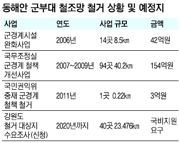 강원도는 영동 지역 철조망은 2006년부터 2011년까지 199억원을 들여 전체 210㎞ 가운데 49㎞를 철거했지만 2012년 이후에는 추가로 철거한 적이 없어 민원의 온상이 되고 있다고 15일 밝혔다. 그나마 해양수산부가 철조망 철거를 맡았던 2010년 이전에는 필요에 따라 어느 정도 철조망이 제거돼 왔지만 이후 국방부로 업무가 옮겨지면서 철조망 철거는 거의 이뤄지지 않아 주민들의 원성이 높다.