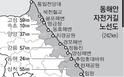 행정자치부는 강원도 동해안을 따라 6개 시·군을 가로지르는 242㎞ 구간 자전거길을 개통한다고 7일 밝혔다. 2010년부터 2015년까지 6년에 걸쳐 예산 360억원(국비 180억원, 지방비 180억원)을 투입했다. 이번에 개통되는 자전거길은 고성에서 부산까지 720㎞를 잇는 동해안 자전거길 가운데 일부다. 동해안 자전거길은 앞으로 단계적으로 개통할 예정이다.