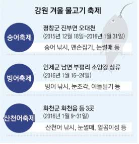 눈과 얼음의 계절 겨울이 왔다. 올겨울은 슈퍼 엘니뇨로 개나리가 철 없이 피는 ‘따뜻한 겨울’이지만 곧 동장군이 찾아와 하얀 얼음의 한겨울로 접어들 것이다. 강원도 산간마을 곳곳에서 매콤한 추위가 좋은 겨울 축제를 다양하게 선보인다. 특히 청정 산골에서만 서식하는 빙어, 송어, 산천어 등 계곡의 물고기를 테마로 한 겨울축제가 인기다. 주말과 겨울방학에 추위를 만끽하기 위해 강원도 물고기 축제장으로 고~고~씽~.